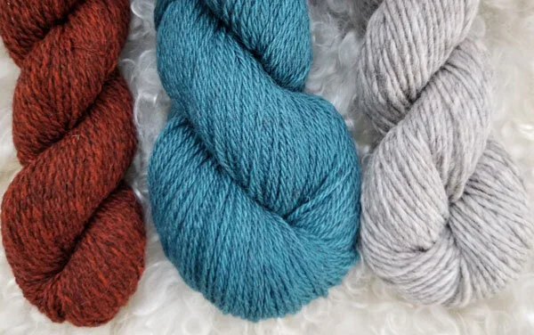 These yarns have no ‘flop factor’. From left to right: Hudson+West Forge, North Light Fibers Water Street, The Farmer’s Daughter Soka’pii.