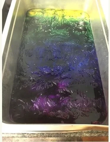 Then she’ll experiment with her collection of primary colors to get just what she wants. From there, she applies the dyes to the yarn in stages, one color at a time. Careful blending allows for soft yet clear cut changes in color, rather than abrupt changes. When the first side has the amount and depth of color that pleases Leann, she flips the yarn over! At this point there will be some white spots of yarn where the dye didn’t get to the bottom of the dye pot. She colors these in to get the finished product. Now we know why each skein of yarn is a bit different!