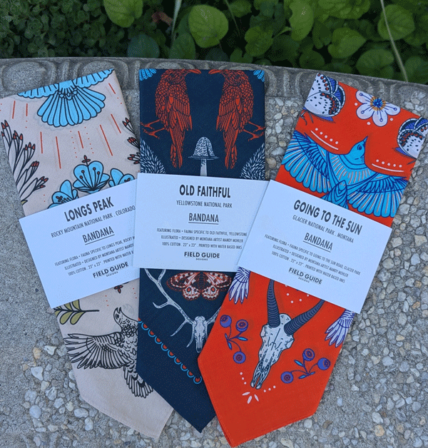 Field Guide Designs Bandanas and Slap Koozies arrived just in time for the yarn crawl! These are ‘landmark bandanas’ that feature both animals and plants from places such as Glacier National Park, the Grand Canyon, Long’s Peak, Montana’s Bison Range, Yellowstone, and more. Included with each bandana is a list of what is featured in the design. Open them up to get the full impact of these beautiful designs celebrating the American West.