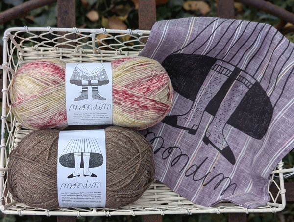 Mondim (mohn DEEM) is a fingering weight worsted spun yarn and is aptly named after a village that used to have a large sock knitting cottage industry. When you look at the label, you’ll see the bottom of a skirt and socks! There are different combinations of socks and skirts on the labels; have fun finding them all!