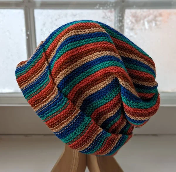 Lindsay Degen’s Gather Garter Hat is lighter weight and has a fun slouchy pleated top. You knit 4 row stripes in garter stitch to make a large rectangle. It is seamed and then comes the magic! The pattern tells you exactly how to close the top to create the accordion pleats! That’s it!