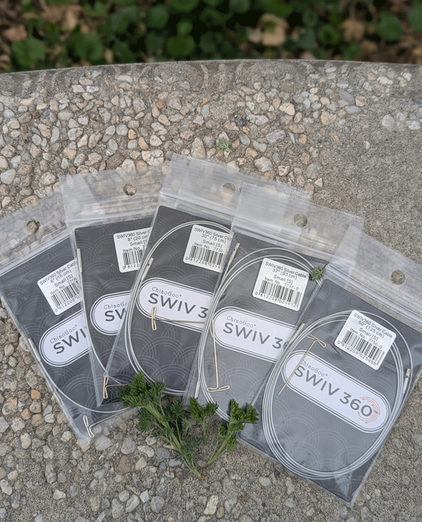 We also want to tell you about our swivel cords for ChiaoGoo interchangeable needles. They are silver but never fear, they are the same material as the red cables! I’m knitting with swivel cables right now and I love them! They reduce twisting and rotate with ease. I didn’t realize how nice they were until I went back to using a regular non-swivel cord.