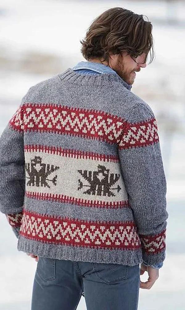 Cowichan is pronounced COW i chen and means ‘the warm land’. The designs of these sweaters are closely tied to the cultural identity of the Coast Salish people. Only knitwear handmade by them can be called genuine Cowichan and they’re labeled as such. Anything else is labeled ‘inspired by’, ‘Cowichan style’, or simply a Canadian sweater.