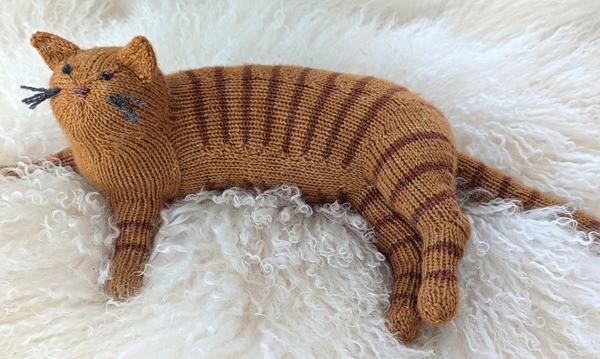 As a general rule, these patterns use aran or bulky weight yarn. The Library Cat and the Nursery Kittens use worsted weight and the Tiny Parlour Cat uses fingering. The cats need to be knit at a tight gauge to prevent the stuffing from showing, so they’re knit using smaller needles than you’d think.